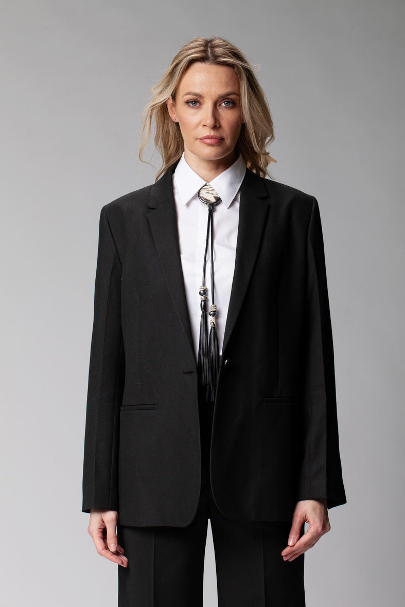 Marmurinis kaubojaus tipo papuošalas sukuria stiprios ir elegantiškos moters įvaizdį. Jo tekstūra sukūriau iš balto ir juodo molio, naudodama sudėtingą techniką, kuri leidžia išgauti autentišką marmuro efektą. Ilgas kaklo papuošalas tarsi talismanas, suteikiantis pasitikėjimo savimi, vidinės jėgos ir išskirtinumo pojūtį. Dėl savo unikalumo tai vienas mėgstamiausių ir dažniausiai pasirenkamų mano kūrinių.