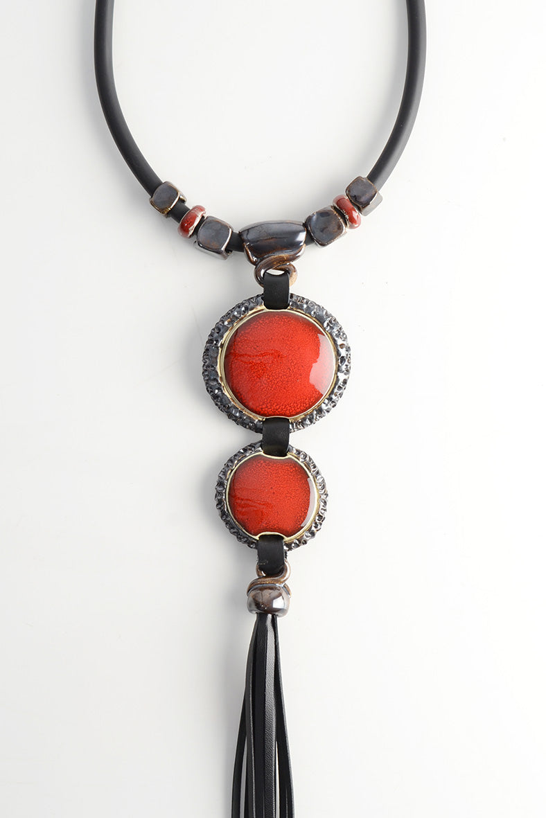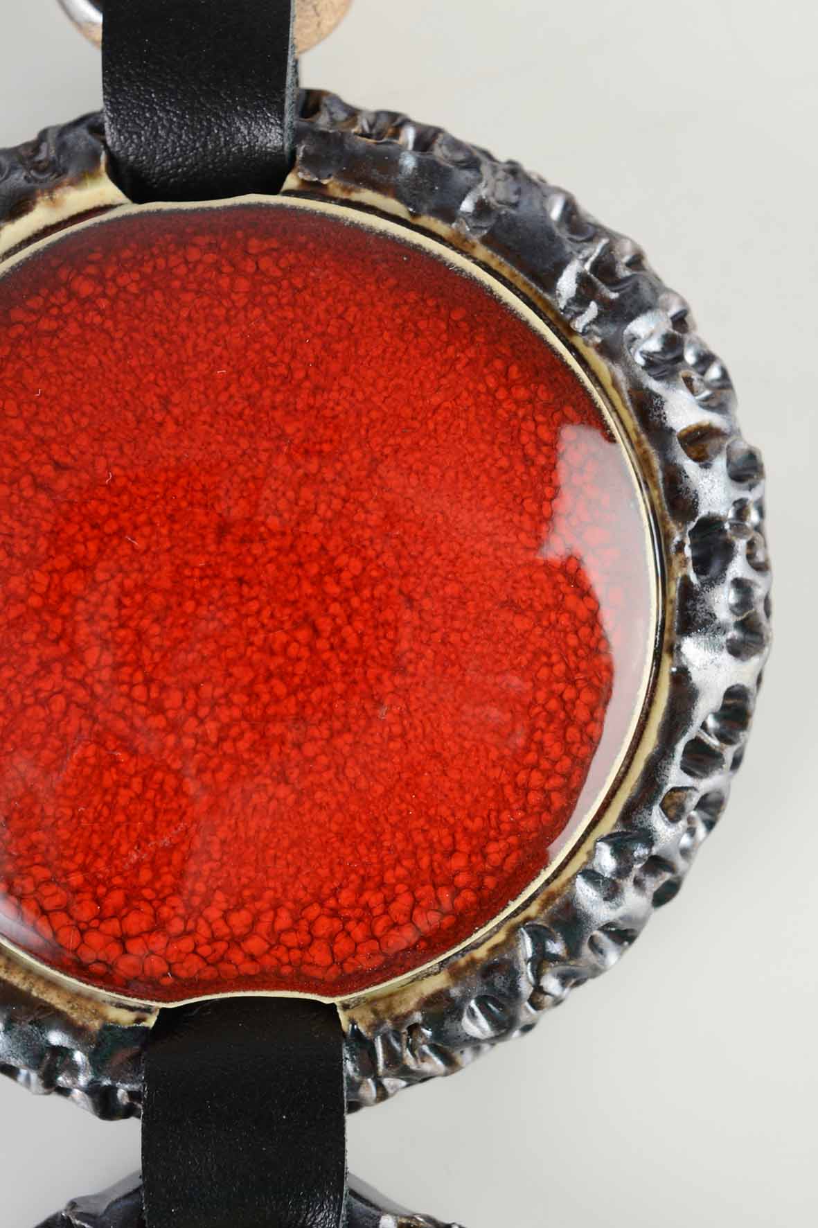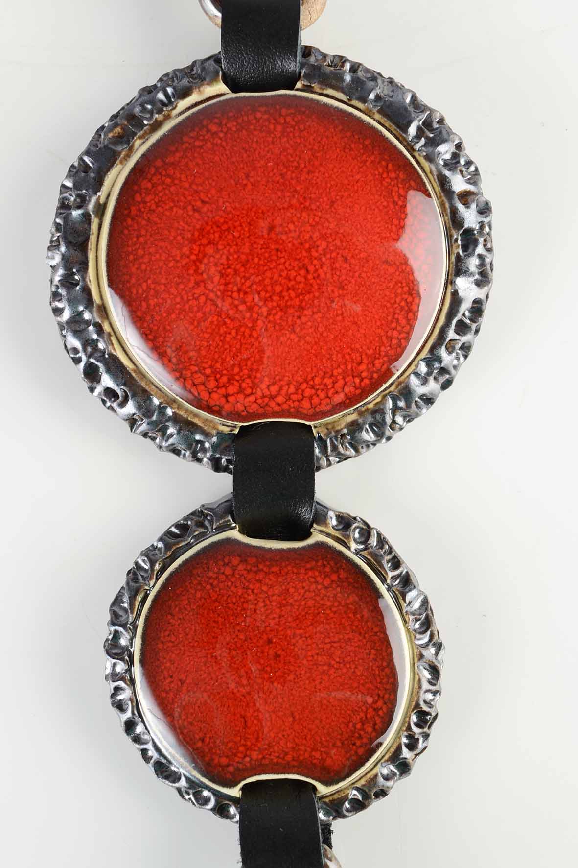 Raudonas stambus kaklo papuošalas iš odos ir keramikos
