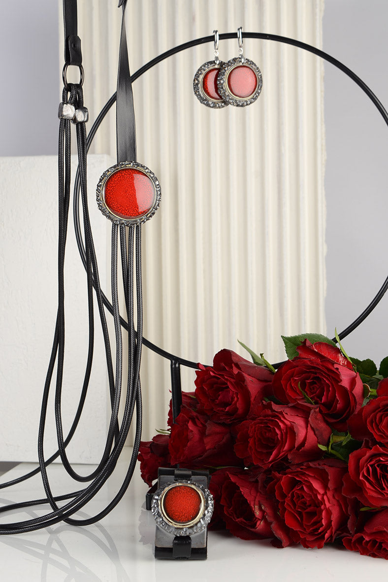 This necklace belongs to the BEGINNING collection – where strength and femininity are born together. Crafted from ceramic and waxed silk cords, it flows softly against the skin and creates a striking silhouette. This multifunctional necklace for women can be worn in three ways: as a chunky choker close to the neck, as a long pendant necklace, or crossbody for a unique statement look. The pure red tone is versatile, easily paired with a little black dress, white shirt, or other monochrome outfits. Combine it with leather bracelets, handmade earrings, or other unique jewelry pieces from my collection for a cohesive look. This necklace is more than an accessory – it’s a personal statement. Collection BEGINNING
